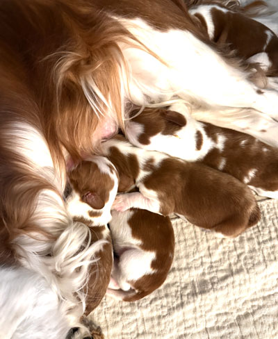 Söta lilla Fiona hade en lyckad dejt med stiliga herren Messi som resulterade i fyra goa valpar. Fiona är en exemplarisk, lugn och fin mamma som njuter i valplådan med sina runda valpar. De behöver inte konkurrera om mjölken vilket gör dem till väldigt nöjda valpar. De växer så det knakar och är jämna och fina. Vi ser så mycket fram emot att följa utvecklingen av dessa och förväntar oss pigga, busiga och snälla kompisar som gärna följer med på familjens alla upptåg! Läs mer om kullen här.